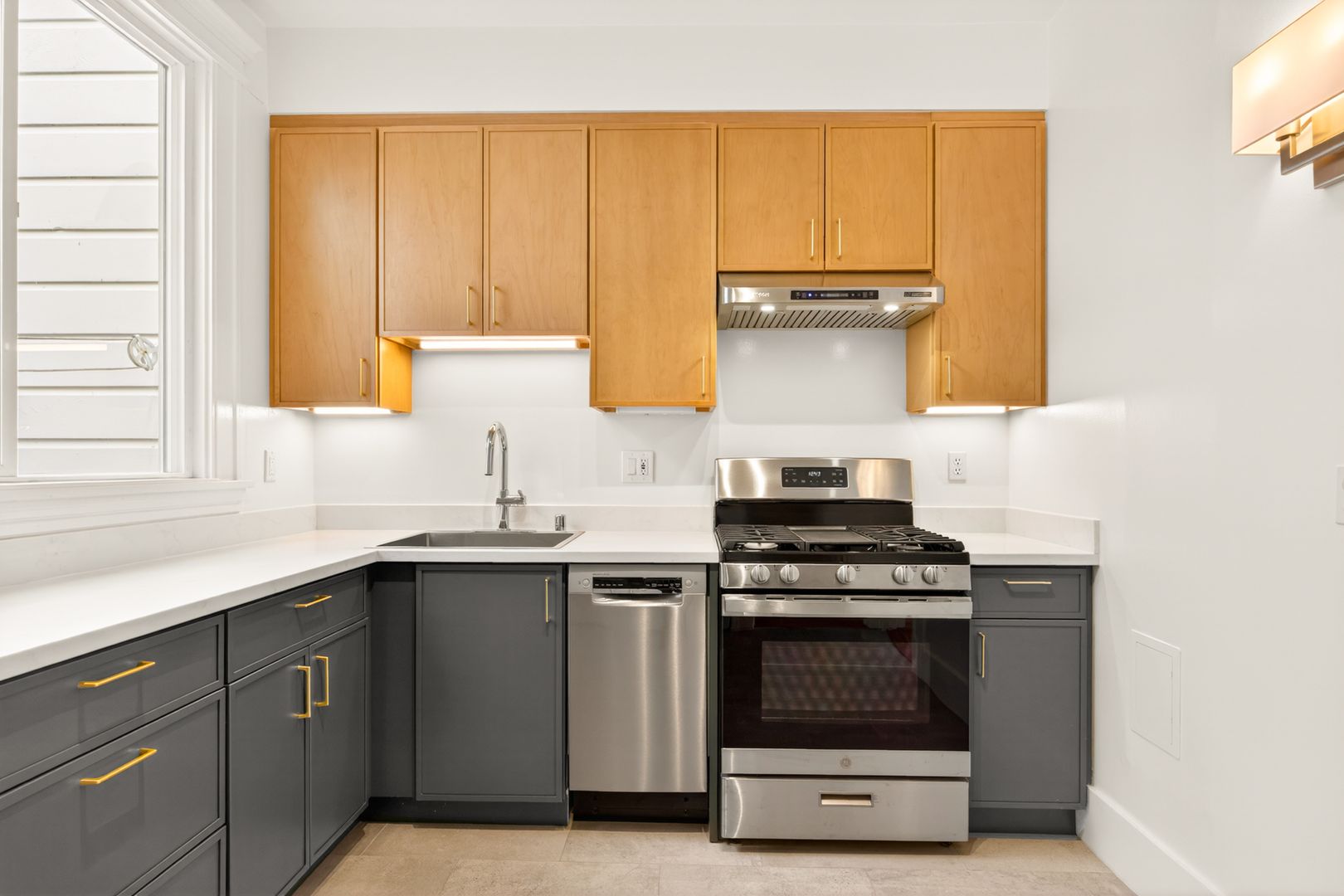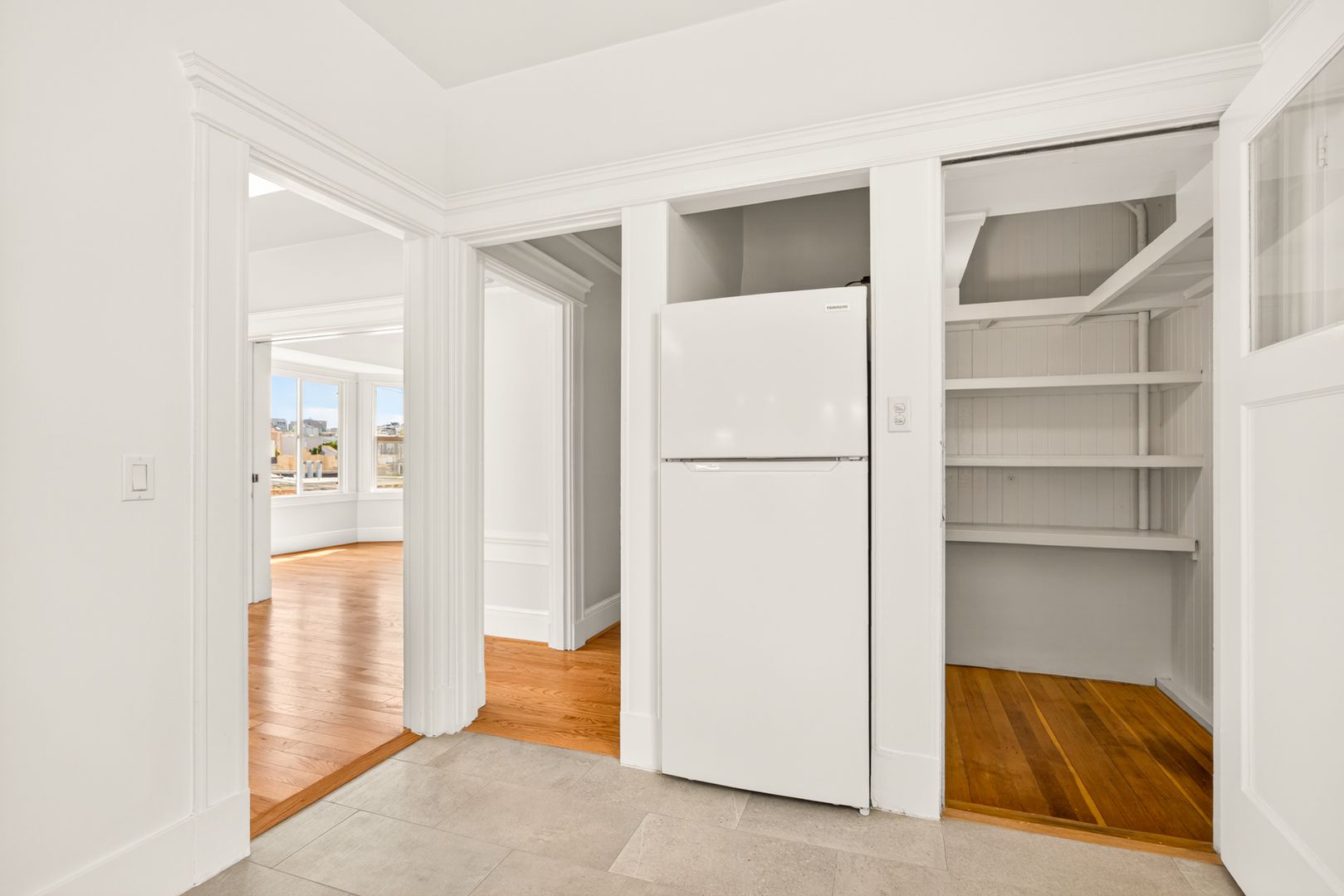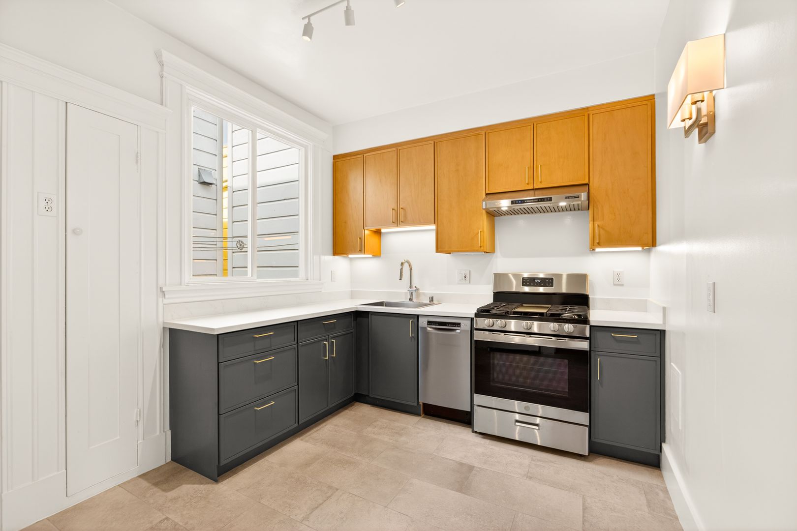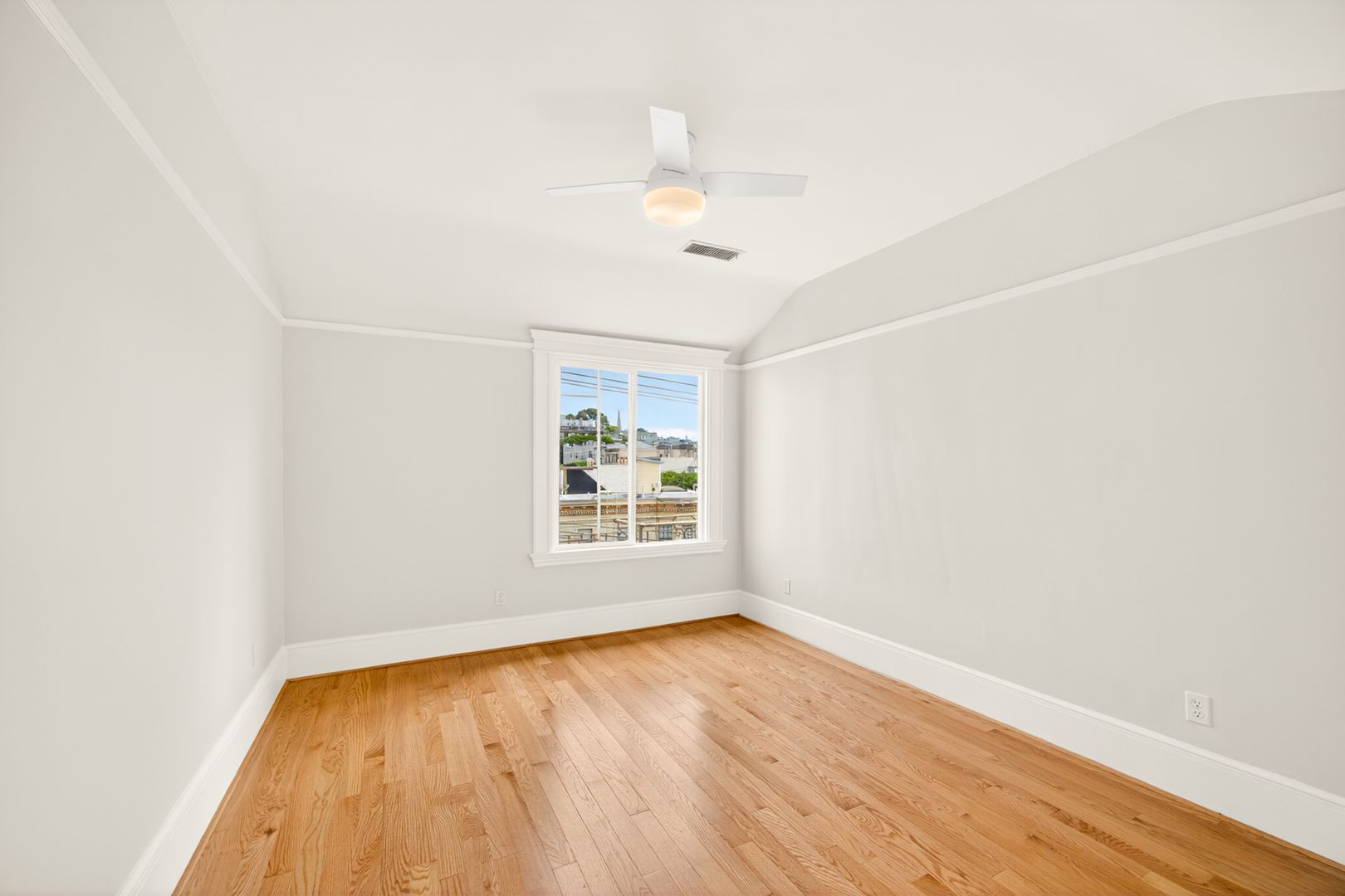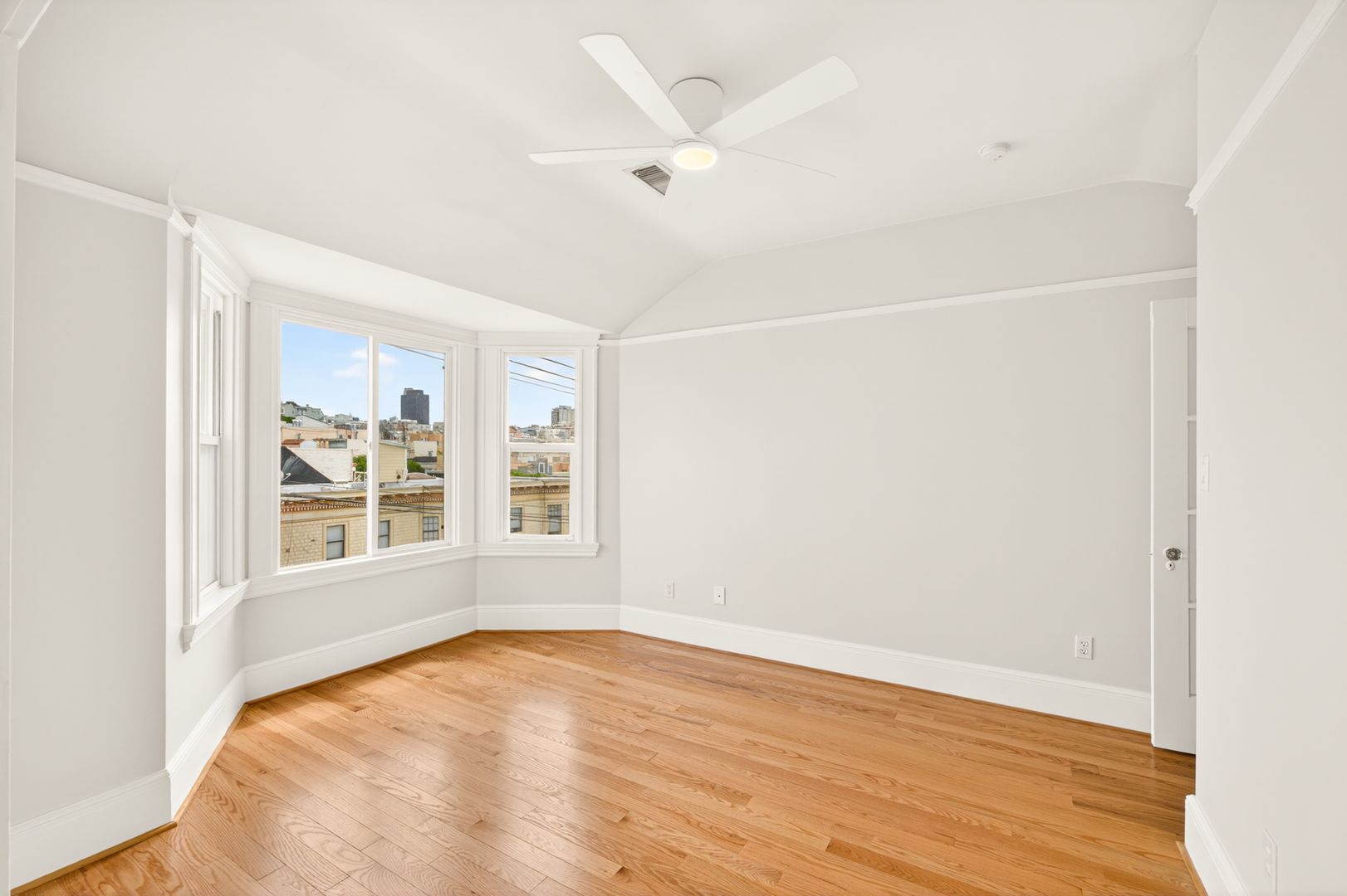 This spacious 2-bedroom, 1 (split) bath, top floor apartment features lots of natural light, fully remodeled kitchen/bathroom, with new 3/4" oak hardwood floors throughout, city views from double bay windows. Ample closet and storage space throughout. Middle room can easily be transitioned into a second bedroom by closing the pocket double doors to separate from the living room. New light fixtures throughout. Large storage/bonus room next to kitchen. All new appliances with new Bosch dishwasher.